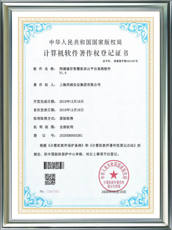 Computer Software Works Registration certificatorium Bangpu City Smart Pump Room Temperature et Umor Control System Platform Software V1.0